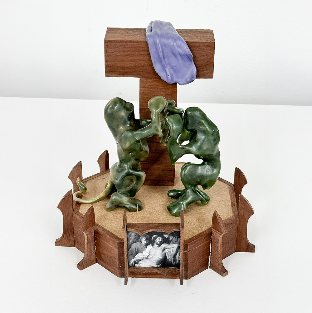 Pauline Chariot [ Apotheosis Fragment ], 2025Black Walnut from the Delano Family Saw Mill, Casting Wax, beeswax, MDF, Forged Iron, Misc hardware and Xerox on Paper