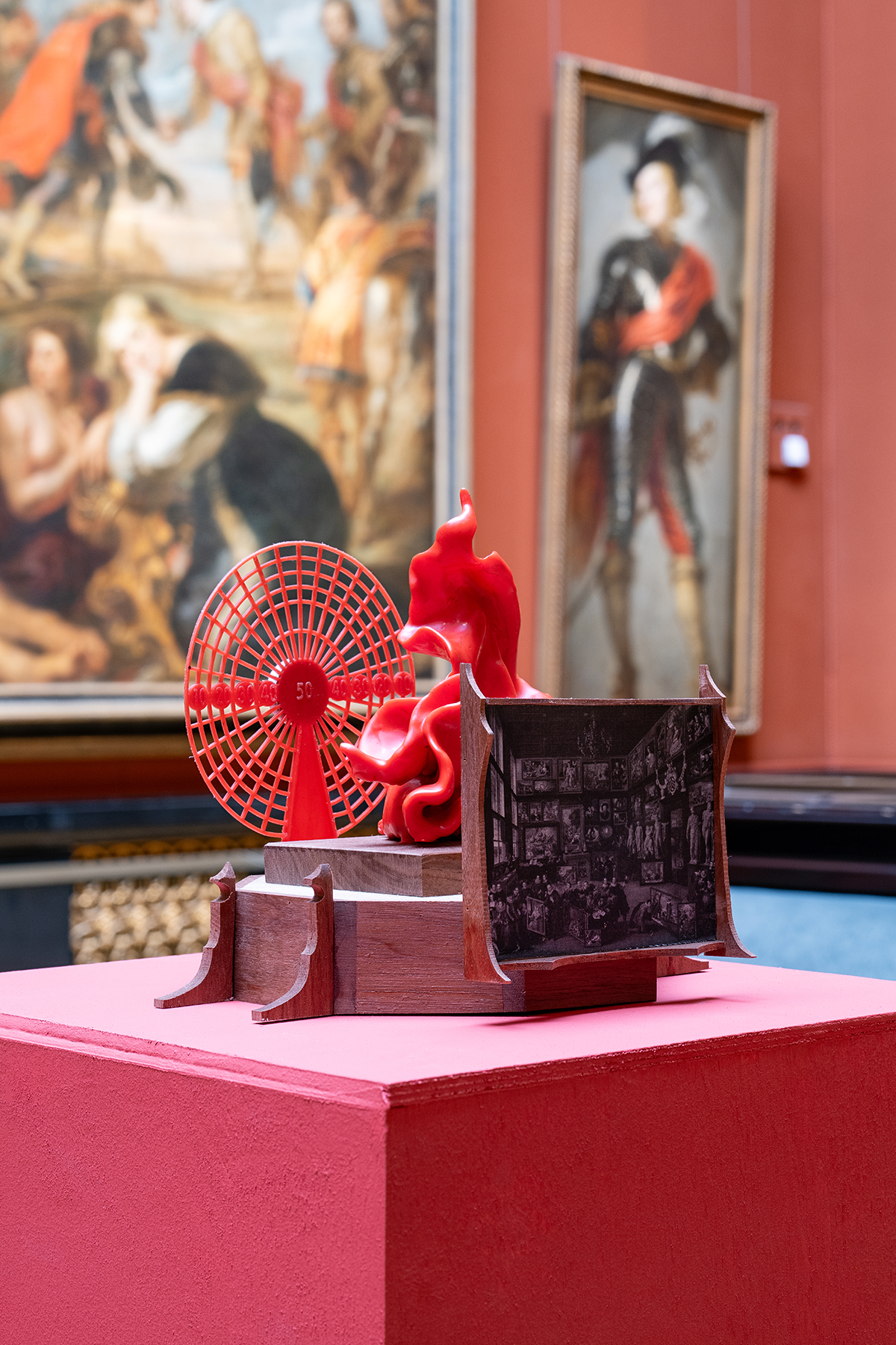 After Rubens [ Eucharist Veil ], 2025Black Walnut from the Delano Family Saw Mill, red pigment, beeswax, MDF, Forged Iron, fly swatter from Fall River, Misc hardware and Xerox on Paper