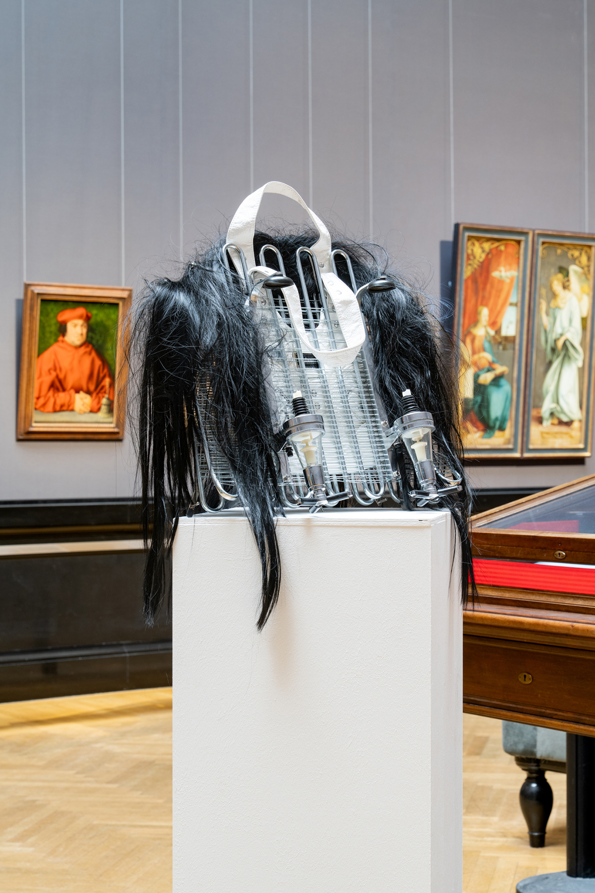 Faux-hair, plastic, chrome steel, fabric, metal